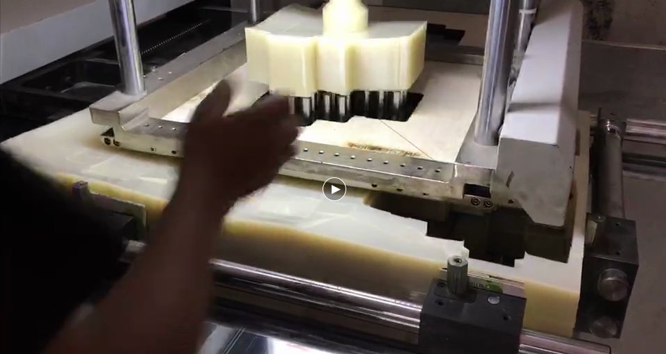 A2: A drawer type mold base and a spinning pin base are innovatively designed. The mold base is able to bear a sheet with two boxes ranged in opposite directions or more boxes of different sizes and shapes, as is shown below. In terms of boxes ranged in opposite directions, the direction of the products can be identified by the translational motion of the upper mold while the spinning of the ejector pins in the lower mold makes it possible to match the box shape in the upper mold, both realized at the same spot. Nevertheless, two-head machines have to complete these two tasks in different spots.