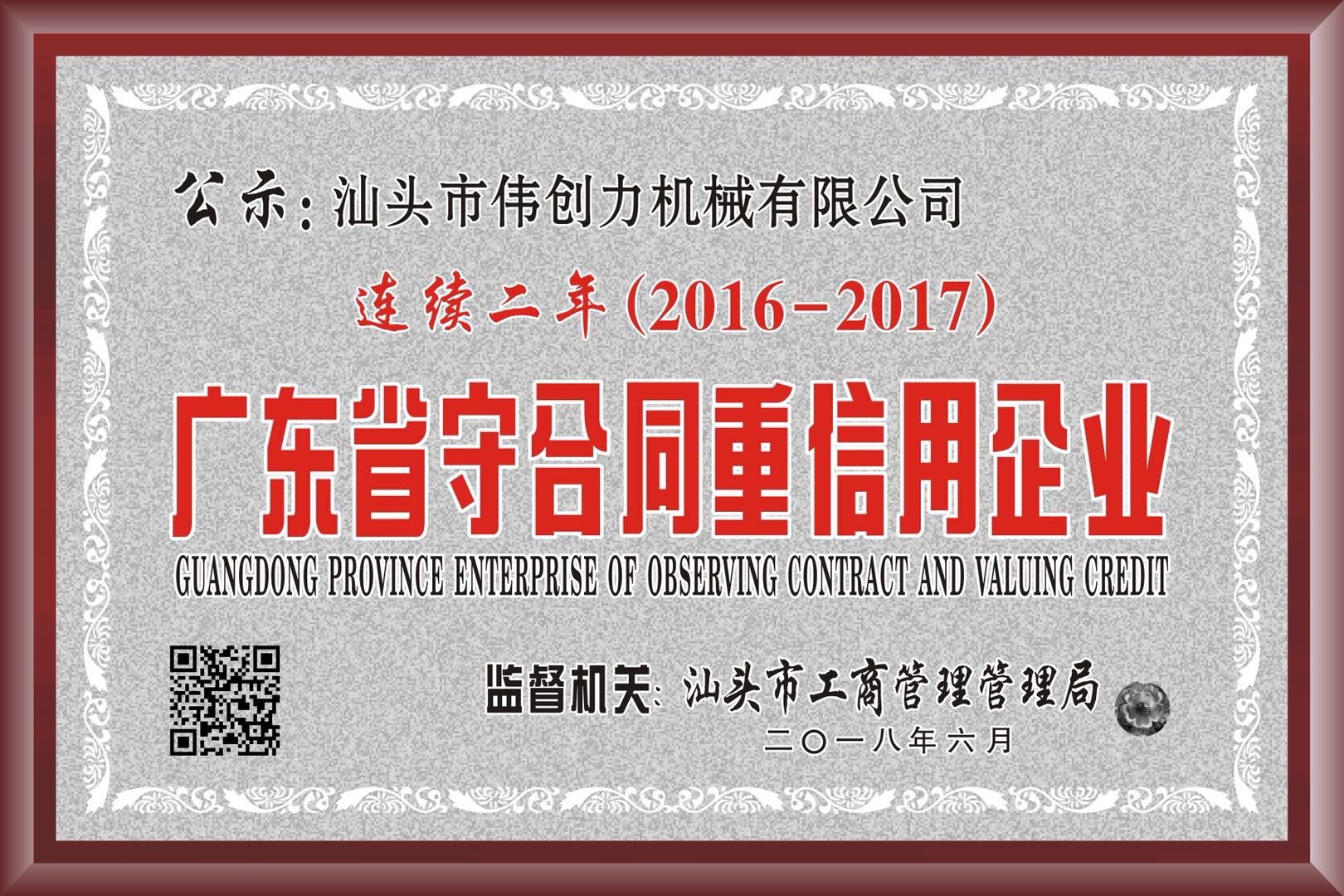 2018年汕頭市偉創(chuàng)力機(jī)械有限公司連續(xù)二年被評為"守合同重信用企業(yè)"